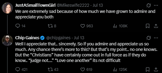 When confronted by concerned Christians, Chip’s first response was to play the victim card and state that Christians were jumping to the wrong conclusions by being judgmental of the situation. He argued that they should first listen and learn, emphasizing the importance of understanding different perspectives before casting judgment. However, it is crucial that we also speak truth and not associate in such ways with anything in regards to promoting a lifestyle of active sinning against God, as this can lead individuals further astray. He then proceeds to imply that non-believers would be hurt by this response and turned away from Christianity, suggesting that a more palatable approach might be necessary for outreach. This “Christianity” that Chip refers to is, however, a falsehood, for it seems to promote wickedness at the expense of the truth and prioritizes acceptance over righteousness. It seems to want to conform to the world rather than Christ, offering a diluted version of the faith that lacks the transformative power required for genuine Christian living. Such beliefs and actions are how one forfeits their soul in the pursuit of seeking approval from the world, risking the very core of Christian teaching meant to guide those toward repentance, righteousness, and eternal life.
